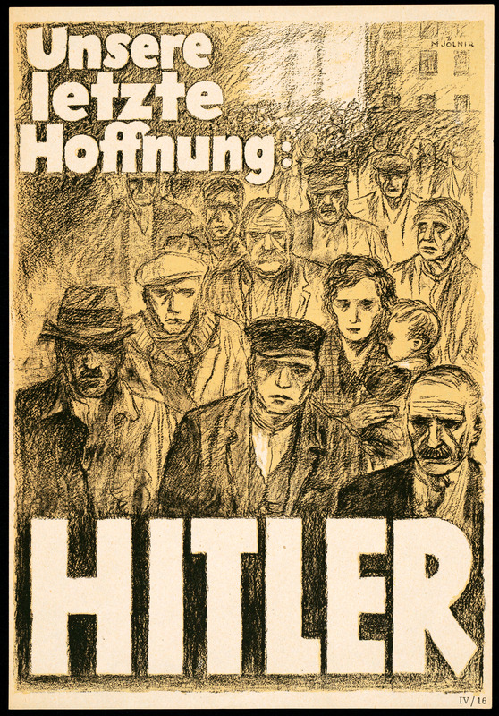 This poster, by the Nationalsozialistische Deutsche Arbeiter-Partei (NSDAP), is meant to signify the growing number of unemployed in Germany-- in 1929: 2.8 million, 1930: 4.4 million, 1931: 5.7 million, 1932: 5.8 million, winter 1932/1933: 6 million. This results in a favorable climate for the rise of the right-wing parties. After Hitler gave a speech at the Industrial Club in Düsseldorf in January 1932, industry leaders donated significantly to the Nazi election campaign. Meanwhile, the Communist Party of German does not benefit from the same level of support.
