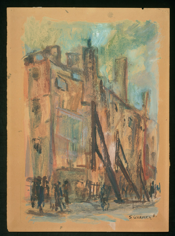 Samson Schames hailed from one of the oldest Jewish families in Frankfurt. Trained in the Staedelschule, he worked in graphics, textiles and oils. After 1934 when Jews were no longer allowed to display their work, he became a member of the newly founded Cultural Association of German Jews and created set designs. In 1939 Schames emigrated to Great Britain, where he joined the Free German Cultural Association in London. At the outbreak of World War II, he was interned as an enemy alien near Liverpool and took this involuntary stay as an opportunity to develop new art techniques in unconventional media, mostly detritus found in the camp. After his release, Schames volunteered for the Civil Defense and recorded his experience in a series of paintings called Bombed-Out London, depicting the London blitz. In 1948, Schames and his wife emigrated to New York, where he enjoyed a successful artistic career.