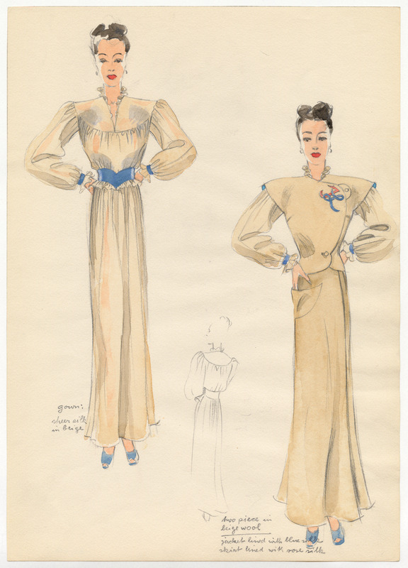 Ritter Marcus, Lucie: Fashion illustration : sheer silk beige gown, wool jacket, Leo Baeck Institute, 84.413.