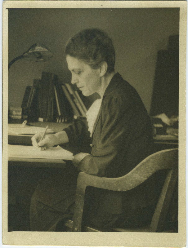 Dr. Marta Fraenkel working at her desk, Leo Baeck Institute, F 23614.