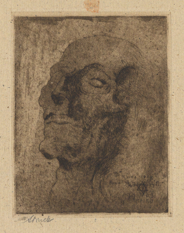 Hermann (Chaim Aaron ben David) Struck was born in 1876 in Germany. He is best known as a master etcher, lithographer and early Zionist. He studied for five years at the Berlin Academy and in 1908 wrote "Die Kunst des Radierens" (The Art of Etching), while mentoring artists such as Marc Chagall, Max Liebermann and Lesser Ury. His art was included in an exhibition at the Fifth Zionist Congress and he helped establish the religious Zionist movement called Mizrachi. Struck was an Orthodox Jew but believed that culture and religion could thrive cooperatively in the Land of Israel. He emigrated to Haifa where he created an artistic community and participated in the development of the Tel Aviv Museum and the Bezalel art school in Jerusalem. Hermann Struck died in 1944.