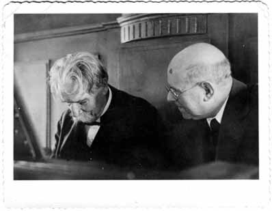 Musicologist and philosopher Albert Schweitzer at a piano with cellist and conductor Pablo Casals, circa 1950?, Leo Baeck Institute, F 34547.