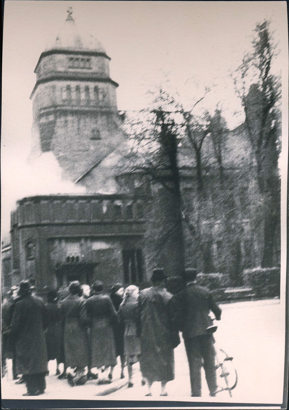 Burning synagogue in Bamberg after Kristallnacht : people watching, Leo Baeck Institute, F 243.