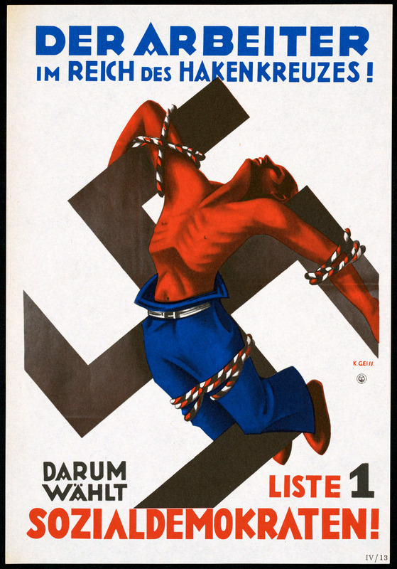 The swastika symbol of the Nationalsozialistische Deutsche Arbeiterpartei (NSDAP) party is reinterpreted here by the Sozialdemokratische Partei Deutschlands (SPD) as a medieval instrument of torture for workers.