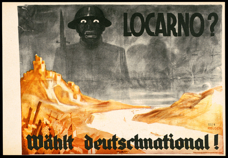 This poster refers to the Locarno Treaty of October 16, 1925. The poster was produced by the German National People's Party (Deutschnationale Volkspartei, or DNVP), as propoganda about the racial implications of the Locarno Treaty and nearby Morocco.