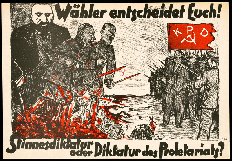 The poster symbolizes the central concerns of the rise of Communism in the first years of the German Republic. A small contingent from the SPD (Sozialdemokratische Partei Deutschland) flees from the the KPD (Kommunistische Partei Deutschlands) side to the capitalist-controlled military side, which is bathed in blood. The blood is an allusion to the repeated joining of the majority Social Democrats with the army against proletarian uprisings ("workers' murderers"). One of the two military officers bears a resemblance to Hans von Seeckt, chief of staff for the the Reichswehr since March 1920.The word “Stinnesdiktatur” is a wordplay, combining the existing word “Sinnesdiktatur” (= Dictatorship of the mind) with “Stinnes-Diktatur” (= Dictatorship of [Hugo] Stinnes). Hugo Stinnes (1870-1924), who is depicted in the poster in the upper left corner in his black suit with his black beard, was an entrepreneur and industrialist, who benefited largely during Germany’s inflation after World War I. The poster's message is that there is a choice between the dictatorship of the mind through Hugo Stinnes or the dictatorship of the proletariat.
